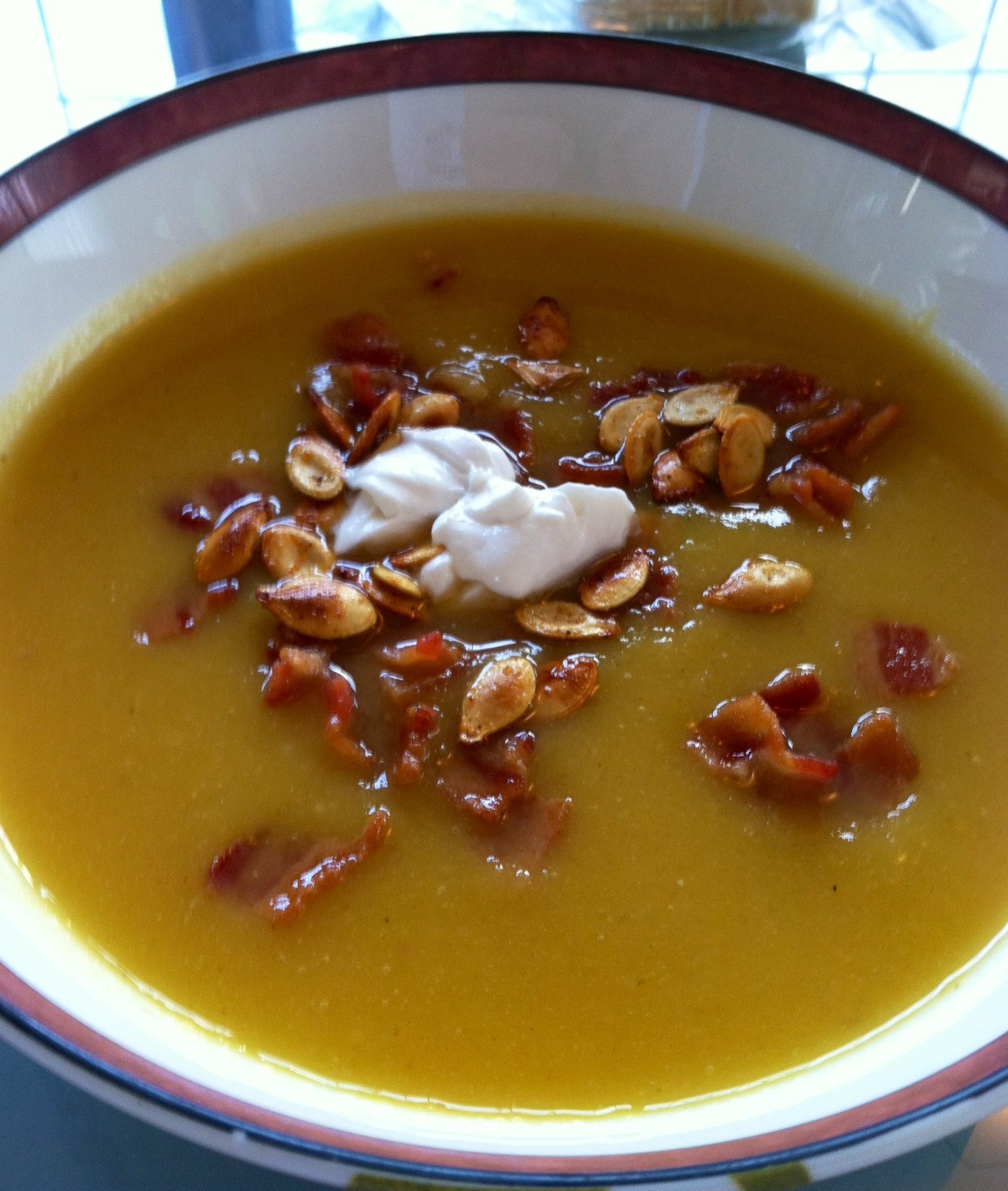 8.      Ladle soup into bowls and garnish with bacon bits, roasted squash, pumpkin, or sunflower seeds, and/or a dollop of soy sour cream. This soup is delicious when it’s warm on a winter night or you can refrigerate it to enjoy on a cold summer day!